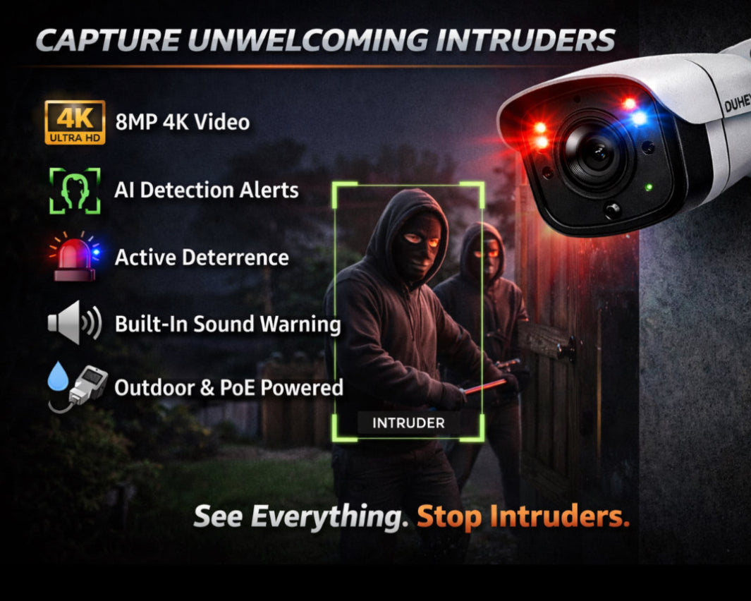 The DuhEye Sentinel 8MP is a professional-grade outdoor security camera designed for reliable, proactive protection. Featuring 8MP 4K ultra-high-definition resolution and AI face detection, it delivers sharp detail and accurate alerts while reducing false alarms.